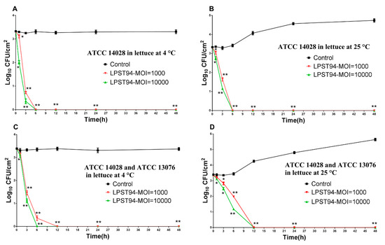 Effectiveness of phage LPST94 in reducing the S. Typhimurium ATCC 14028 and S. Enteritidis ATCC 13076 in lettuce. (A) Effect of phage LPST94 on growth of S. Typhimurium ATCC 14028 on lettuce at 4 °C, (B) Effect of phage LPST94 on growth of S. Typhimurium ATCC 14028 on lettuce at 25 °C, (C) Effect of phage LPST94 on growth of Salmonella mixture (S. Typhimurium ATCC 14028 and S. Enteritidis ATCC 13076) on lettuce at 4 °C, and (D) Effect of phage LPST94 on growth of Salmonella mixture (S. Typhimurium ATCC 14028 and S. Enteritidis ATCC 13076) on lettuce at 25 °C. Values represent mean with standard deviation of three determinations. ** Significance of p < 0.01; * Significance of p < 0.05.