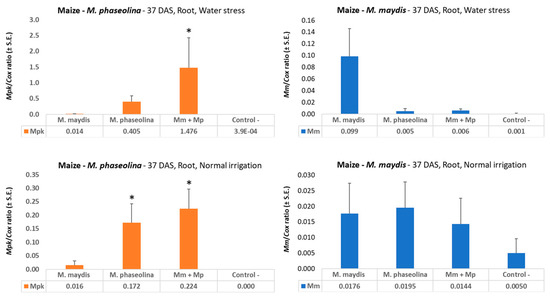 qPCR diagnosis of M. maydis and M. phaseolina in maize sprouts. A full-growth season pot experiment under field conditions was conducted in the spring and summer of 2019 with a late-wilt-susceptible maize genotype prelude. The quantitative real-time polymerase chain reaction (qPCR) was used to identify the ability of the pathogens, alone or in mixed inoculation, to infect and colonize maize root tissues 37 days after sowing (DAS). Half of the treatments received reduced irrigation (water stress, upper panel, see Table 1). The control is soil taken from a nearby field with minor levels of M. maydis or M. phaseolina infestation. The y-axis values are M. maydis relative DNA (Mm) or M. phaseolina relative DNA (Mpk) abundance normalized to the cytochrome c oxidase (Cox) DNA. Vertical upper bars represent the standard error of the mean of 10 replications (pots, each containing one plant). When existing, significance from the control is indicated as * = p < 0.05.