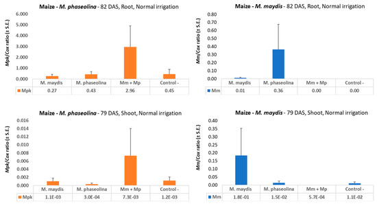 qPCR diagnosis of M. maydis and M. phaseolina in maize at the end of the season. The experiment is described in Figure 2. M. maydis relative DNA (Mm) or M. phaseolina relative DNA (Mpk) abundance normalized to the cytochrome c oxidase (Cox) DNA was evaluated at 82 DAS (25 days after fertilization, DAF) in roots in the 2018 experiment (upper panels) and 79 DAS (25 DAF) in shoots in the 2019 experiment (lower panels). Vertical upper bars represent the standard error of the mean of 10 replications (pots, each containing one plant).