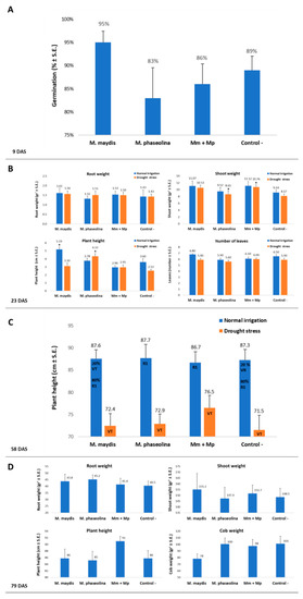 Symptoms evaluation and yield assessment in maize. Plant developmental values and yield assessment was made for the plants in the 2019 experiment described in Figure 2. Sprout emergence, 9 DAS (A), phenological stage, 23 DAS (B), plant height, 58 DAS (C), and growth and yield assessment 79 DAS and 22 DAF (D) were determined after the inoculation of the plants with M. maydis and M. phaseolina, alone or in mixed inoculation. Vertical upper bars represent the standard error of the mean of 10 replications (pots, each containing one plant from 23 DAS onwards). When existing, significance from the control (untreated) is indicated as * = p < 0.05.