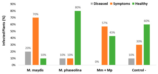 A fully randomized statistical design was used in all experiments. Statistics and data analysis were carried out using the JMP program, 7th Edition, SAS Institute Inc., Cary, NC, USA. For the evaluation of M. maydis and M. phaseolina infection outcome in the experiments, the one-way ANOVA followed by post-hoc multiple comparisons of Student’s t-test for each pair was used. The t-test compared (with a significance threshold of p = 0.05) each treatment to the control.