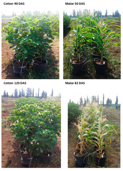 The sowing of the maize and cotton plants was performed on May 21, 2019. The maize plants’ fertilization took place 58 DAS (about one week after the male flowering). At that age, in the maize plot that received a regular water supply, most of the plants were at the R1 development stage. At the same age (58 DAS), the maize plots that had received reduced irrigation were at the VT development stage (tasseling: plants with fully visible tassel branches). The low water supply did not allow the plant to continue developing beyond this age (58 DAS), and they suffered from severe drought. Consequently, the reduced water supply plots were harvested one week later, 65 DAS, before the development of cobs. The maize plants that received a regular water regime were harvested on August 08, 2019 (79 DAS, 21 DAF). In the cotton plots, on 58 DAS, the plants had blossom buttons but had not yet flowered. The cotton plants flowered about one week later and were harvested on October 29, 2019 (161 DAS(.