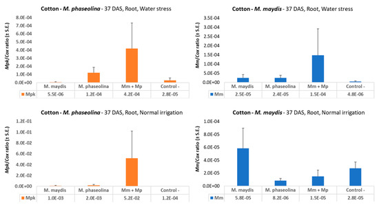 It has now become evident that optimal water supply can reduce late wilt disease in maize. Indeed, our past experience [6,30,33] and a review of the literature support the conclusion that high water potential is one of the most important agrotechnical aims for restricting late wilt disease progression [17,47,48,49]. The results presented in the current study are in line with this conclusion, with nearly 10 times higher M. maydis DNA in drought-stressed maize sprouts (37 DAS, Figure 2). Interestingly, drought pressure also caused about three times higher M. phaseolina DNA in young maize plants, but both pathogens did not flourish under a restricted water regime in cotton (Figure 6) compared to regular irrigation conditions. A possible explanation is that the applied restricted water regime did not produce drought pressure as expected. Indeed the cotton plants in the decrease water irrigation pots were healthy and had an apparent healthy development.