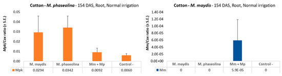 qPCR diagnosis of M. maydis and M. phaseolina in cotton at the end of the season (154 DAS). The experiment was conducted in 2018. The control is a soil taken from a nearby field with minor levels of M. maydis or M. phaseolina infestation. M. maydis relative DNA (Mm) or M. phaseolina relative DNA (Mpk) abundance was normalized to the cytochrome c oxidase (Cox) DNA. Vertical upper bars represent the standard error of the mean of 10 replications (pots, each containing one plant).