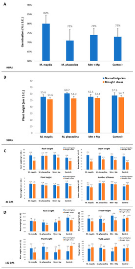 Symptoms evaluation and yield assessment in cotton. Plant developmental values and yield assessment was made for plants in the 2019 experiment described in Figure 7. Sprout emergence (A) and height, (B) 9 DAS, phenological development, 41 DAS (C), and growth and yield assessment, 162 DAS (D), were determined after the inoculation of the plants with M. maydis and M. phaseolina, alone or in mixed inoculation. Vertical upper bars represent the standard error of the mean of 10 replications (pots, each containing one plant 41 DAS onwards). When existing, significance from the control (untreated) is indicated as * = p < 0.05.