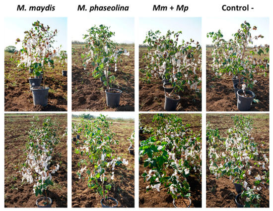 Photograph of the cotton plants under a restricted water regime, in the 2019 experiment (described in Figure 7). The field was photographed 162 DAS. A decreased development of the plants in the M. phaseolina inoculation pots can be seen.