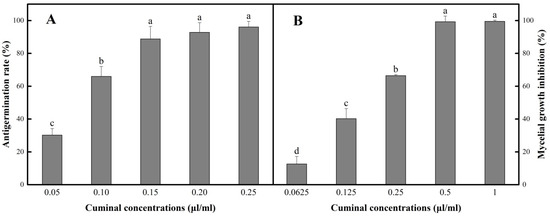 In vitro antifungal activities of cuminal against T. roseum. (A) Antigermination effect against T. roseum conidia. (B) Vapor contact inhibition of mycelial growth. Bars with different letters indicate mean values significantly different at p < 0.05 according to Tukey test. Data are expressed as mean of three replicates ± SD.