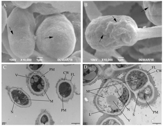 Morphological (A: control, and B: treatment under scanning electron microscopy) and ultrastructural (C: control, and D: treatment under transmission electron microscopy) changes of T. roseum conidia upon cuminal exposure. (CW: cell wall, FL: fibril layer, PM: plasmalemma, M: mitochondrion, S: septum, V: vacuole, N: nucleus, L: lomasome).