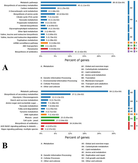 To investigate the enrichment situation of the DEGs in metabolic pathways, these genes were mapped into the KEGG pathways with the Blast2GO program. In total, the 2825 DEGs were mapped into 216 metabolic pathways in which biosynthesis of amino acids (202, 7.15%), carbon metabolism (180, 6.37%), and ribosome (164, 5.81%) were the top three ones. For clearer understanding the effects of cuminal exposure on the fungal metabolism, the KEGG enrichment of DEGs was analyzed for up and down regulated DEGs, separately (Figure 5). A noticeable number of up regulated genes enriched the metabolic pathways (89%), biosynthesis of secondary metabolites (45%), biosynthesis of antibiotics (41%), carbon metabolism (19%), and biosynthesis of amino acids (18%). In particular, citrate cycle, pyruvate metabolism, glycerophospholipid metabolism, mRNA surveillance pathway and peroxisome were also enriched with notable DEGs. From an upper hierarchical view, the top enriched KEGG ways were global and overview maps (A0), carbohydrate metabolism (AA) and other unknowns (HA) (Figure 5A). For down regulated DEGs, the top enriched KEEG ways were metabolic pathways (84%), biosynthesis of secondary metabolites (37%), antibiotics biosynthesis (34%), cell cycle (17%), and glycolysis/gluconeogenesis (12%). From an upper hierarchy, most of these down regulated DEGs function in global and overview maps (A0), carbohydrate metabolism (AA), cell growth and death (DC), and other unknowns (HA) (Figure 5B).