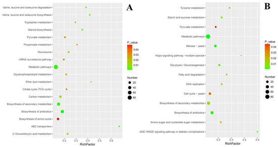 Rich-factor scatter plot of select pathway enriched with DEGs. (A) Up regulated DEGs. (B) Down regulated DEGs. Rich factor is the number ratio of differentially expressed genes to total annotated genes in a pathway. Dot areas show the number of DEGs, and the selection was based on the KEGG enrichment situation and pertinence to the metabolic blocks underpinning the fungal response to cuminal exposure.