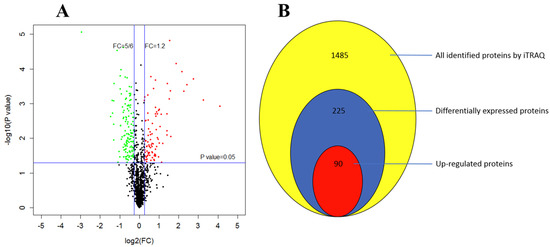 Using the Mascot search engine, the iTRAQ LC-MS/MS investigation generated 94463 spectra and identified 1485 proteins, in which 225 were differentially expressed (Table S3). Among these DEPs, 90 were up regulated while 135 were down regulated (Figure 7).