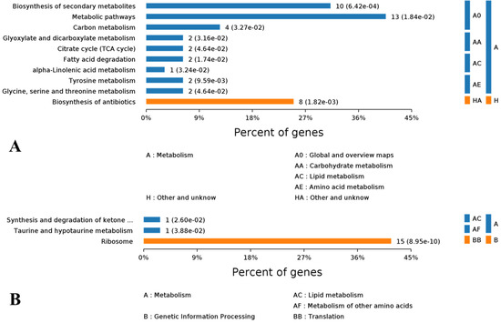 Kyoto Encyclopedia of Genes and Genomes (KEGG) enrichment of differentially expressed genes (DEGs) and hierarchical belonging of each enriched pathway to upper level pathways. (A) Pathway classification of up regulated DEGs. (B) Pathway classification of down regulated DEGs.