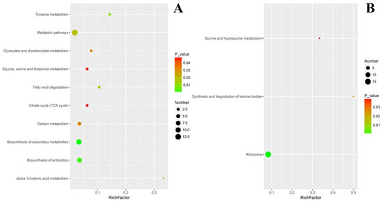 For down regulated DEPs, their pathway enrichment was mainly in ribosome (15%), ketone metabolism and taurine metabolism (Figure 8B). When evaluated with the rich factor, the enrichment of the above DEPs exerted a different extent of influence on their corresponding pathways. With higher rich factors, the enrichment of up regulated DEPs probably and positively modulated alpha-linolenic acid metabolism, tyrosine metabolism and fatty acid degradation. Meanwhile, biosynthesis of secondary metabolites, biosynthesis of antibiotics and citrate cycle were enriched with more up regulated DEPs but with lower rich factors (Figure 9A). In contrast, the situation of down regulated DEPs was different, in that their enrichment conferred higher rich factors for minor pathways such as taurine and hypotaurine metabolism, and synthesis and degradation of ketone bodies, but a lower rich factor for a larger pathway such as ribosome, with 15 down regulated DEPs being enriched (Figure 9B).