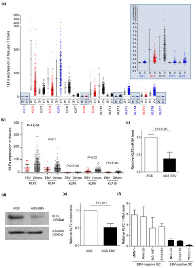 3.1. KLF2 Expression is Suppressed by EBV Infection in Gastric Carcinoma