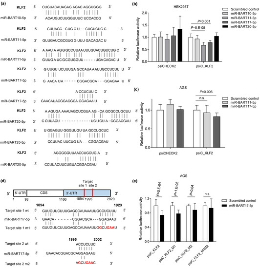Screening of EBV microRNA that targets KLF2. (a) Seed matches between four BART miRNAs and the 3′UTR of KLF2. (b,c) psiC_KLF2 and each BART miRNA were co-transfected into HEK293T cells (b) and AGS cells (c). Luciferase reporter assays were measured 48 h after transfection. Three independent experiments were conducted to confirm reproducibility. Luciferase activity was normalized using internal firefly luciferase activity. The luciferase activity of the cells transfected with each BART miRNA is expressed as a ratio to the luciferase activity obtained from the scrambled control transfected cells. Error bars indicate SDs. (d) Schematic drawing shows the location of the predicted target sites 1 and 2 for miR-BART17-5p on the 3′UTR of KLF2 mRNA (upper panel). Two sites in the 3′UTR of KLF2 that seed match with miR-BART17-5p were mutated individually or together, and the mutated sequences are shown in red (lower panel). (e) Luciferase assay was carried out using AGS cells co-transfected with psiC_KLF2 (wildtype or mutants) and 30 nM miR-BART17-5p. Each value represents the mean ± SD in four independent experiments. Abbreviation: n.s, not significant.