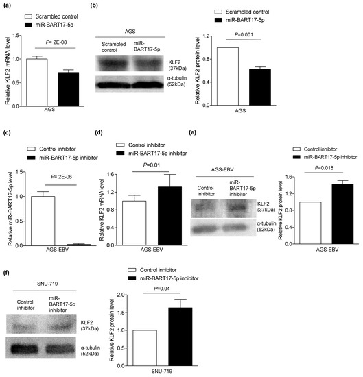 We found that KLF2 expression was lower in EBVaGC than in EBV-negative GC. In the process of testing the hypothesis that EBV miRNAs inhibit KLF2 expression, we found that miR-BART17-5p directly targeted the KLF2 3′UTR to reduce mRNA and protein expression. We also found that miR-BART17-5p promoted cell migration and anchorage-independent growth by reducing the expression of KLF2.