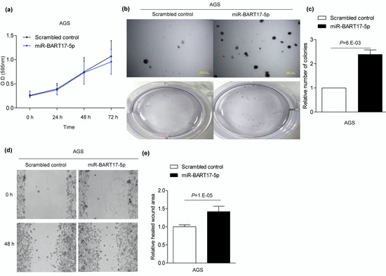 In previous results, miR-BART17-5p negatively regulated the expression of KLF2, therefore we tried to confirm the role of miR-BART17-5p in EBVaGC. To analyze the effect of miR-BART17-5p on cell proliferation, migration, and anchorage-independent growth, miR-BART17-5p was artificially delivered to EBV-negative AGS cells. Cell proliferation was not affected by miR-BART17-5p (Figure 4a). A soft agar colony formation assay showed that miR-BART17-5p promoted anchorage-independent growth by 2.1-fold compared to the scrambled control (Figure 4b,c). A wound-healing assay also showed that migration increased 1.3-fold when miR-BART17-5p was delivered to AGS cells compared with the scrambled control (Figure 4d,e).