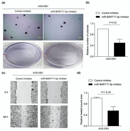 We then investigated the effect of endogenously expressed miR-BART17-5p on the tumorigenesis of AGS-EBV by delivering a miR-BART17-5p inhibitor into cells. A soft agar colony formation assay revealed that anchorage-independent growth was reduced by 50% following miR-BART17-5p inhibition (Figure 5a,b). In addition, wound-healing of AGS-EBV cells was hindered by 44.6% following transfection with the miR-BART17-5p inhibitor in comparison with the control inhibitor (Figure 5c,d).