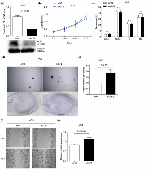 Promoted tumorigenesis of AGS cells through siKLF2. AGS cells were transfected with 30 nM siKLF2 (a–g). (a) KLF2 mRNA level was analyzed by qRT-PCR using a SYBR Green qPCR kit (Upper panel). Western blotting using anti-KLF2 (1:500) antibody showed expression of KLF2. Anti-α-tubulin antibody was used for loading control (lower panel). All experiments were conducted three times independently. (b) Before and every 24 h after siKLF2 transfection, 20 µl of MTT solution was added to each well to assess AGS cell proliferation in four independent experiments. (c) AGS cells were transfected with the negative control (siNC) or siKLF2. The proportion of the cells in each cell cycle phase was evaluated 48 h later by propidium iodide staining. All experiments were conducted four times independently. (d) To conduct soft agar colony formation assay, a transfected AGS cell was harvested after 24 h and seeded in agar. Cells placed in agar were observed after 4–6 weeks in three independent experiments. Upper panels were observed with microscope IX70 through a ×40 objective. Lower panels show the images taken with a camera. (e) Colonies were quantified using Image J software. Error bars indicate SD (n = 3). (f) Wound-healing assay was performed on AGS cells transfected with 30 nM siKLF2 to assess KLF2 function in three independent experiments. (g) Healed wound area was measured by Image J software. Error bars indicate SD (n = 3). Abbreviation: n.s, not significant.