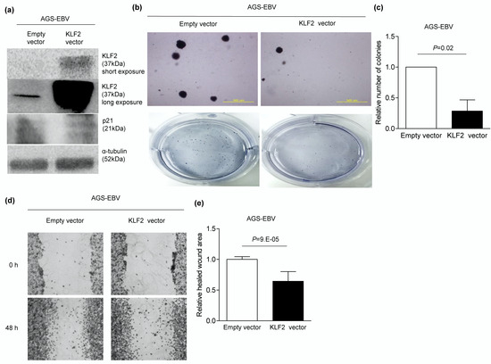 To confirm KLF2 function, a KLF2 overexpression vector was delivered to AGS-EBV, in which KLF2 expression was lower than in AGS. Following KLF2 overexpression (Figure 7a), anchorage-independent growth was reduced by 71% in AGS-EBV cells (Figure 7b,c). In addition, migration of AGS-EBV cells was suppressed by 36% compared to the control vector transfection (Figure 7d,e).