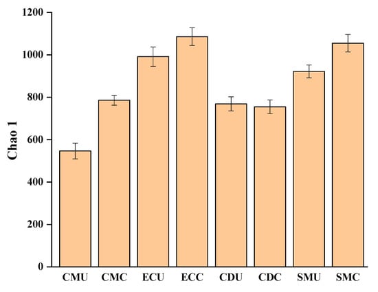Richness of bacterial communities in organic fertilizers using the Chao1 estimator. Samples from compost were denoted CDC, CMC, SMC, and ECC. Uncomposted manure samples were denoted CDU, CMU, SMU, and ECU.
