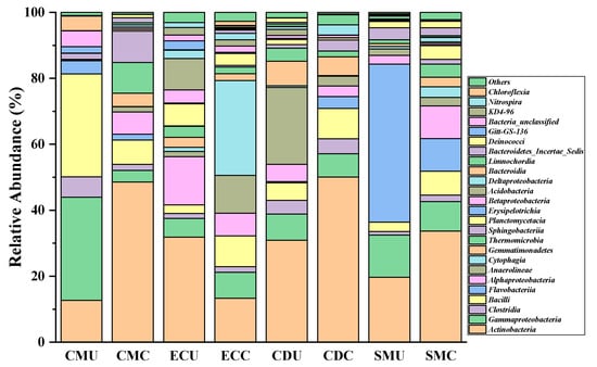 In the CM group, Proteobacteria (36.7%) and Firmicutes (39.4%) were the main phyla in the uncomposted samples, but after composting Actinobacteria was the dominant phylum in the CM, CD, and SM groups. Clearly, composting was conducive to increasing the relative abundance of Actinobacteria while decreasing its relative abundance in the EC groups (Figure S5 and Figure 2).