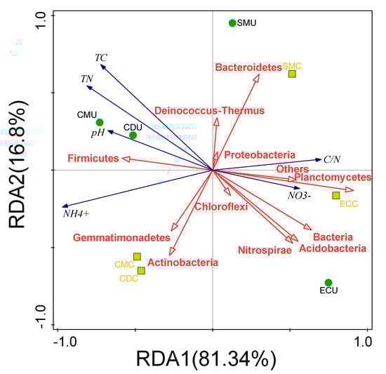 As redundancy analysis shows (Figure 3), Planctomycetes, Bacteria, Acidobacteria, and Nitrospirae relative abundances were positively correlated with NO3− (p < 0.01) but negatively correlated with total organic carbon (TC) and total nitrogen (TN). In contrast, Firmicutes were significantly positively correlated with NH4+ and negatively correlated with NO3−. Among the fertilizer groups, CM and CD showed obvious clustering before and after composting.