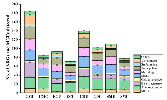 The organic fertilizer samples exhibited a total of 228 ARGs (Figure 4), and up to 184 and 71 ARGs were detected in CMU and ECC, respectively. Although composting resulted in an average of 96 ARGs in the four composted samples, up to 103 ARGs were detected in the CDC sample. This result indicated that ARGs existed widely in organic fertilizer and that the incidence of ARGs was different in different organic fertilizer samples. Manure application not only adds nutrients and organic matter to cultivated soil for crop growth but also introduces ARGs, posing a potential risk to human health.