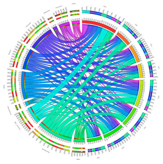As shown in Figure S6, antibiotic deactivation accounted for 41.74% of resistance mechanisms, efflux pumps accounted for 29.36%, and cellular protection resistance mechanisms accounted for 27.06% in the uncomposted samples. The detected ARGs could potentially confer resistance to all the major antibiotics. Of the targets of all the detected ARGs, aminoglycoside, beta-lactam, multidrug, macrolide-lincosamide-streptogramin B (MLSB), TC, and vancomycin antibiotics are important for human medicine (Figure 5), and even resistance genes for the “last-resort” life-saving antibiotic vancomycin were detected [50]. The incidence of ten types of ARGs was determined in organic fertilizer samples (Figure 5). Resistance mechanisms targeting aminoglycosides (7.5–11.6%), TC (5.2–15.6%), multiple drugs (4–16.7%), beta-lactam ((not detected)~28%), and MLSB (5.7–12.9%) were the five most common types in organic fertilizer samples, followed by resistance mechanisms for vancomycin (2.9–32.9%), SA (6.9–13.8%), chloramphenicol (6.9–10.3%), and MGEs (5.2–13%). The incidence of ARGs differed with organic fertilizer sample.