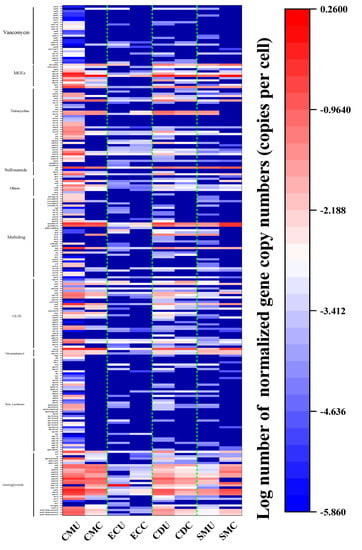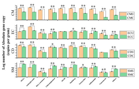 Figure 8 shows the enrichment in ARGs in each organic fertilizer sample, and the total enrichment in organic fertilizer samples was approximated for all ARGs. The absolute gene copy number of ARGs ranged from 0 to 313,328.57 (the CMU sample). This result showed that the antibiotic resistance in different manures showed large discrepancies and that the variation in different antibiotic types varied clearly among organic fertilizer samples, especially those without composting which had the highest abundance.
