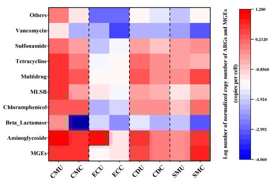The absolute abundance of ARGs in organic fertilizer samples ranged from 2.3 × 104 to 2.49 × 107 copies g−1 solid dry weight (Figure 6). Figure 6 shows that after composting treatment, the content of ARGs in CM and CD groups is reduced, but the EC and SM samples show opposite trends. In EC samples and SM samples, MGEs increased after composting, which was the same trend as that found for ARGs.