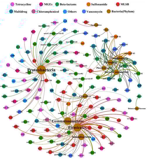 Network analysis of cooccurrence between ARGs, MGEs, and bacteria. Relationships between ARGs, MGEs (relative gene copy number), and bacteria (at the phylum level, 16S rRNA gene sequence data) based on Pearson’s correlation coefficients (p < 0.05). The nodes are colored according to ARG class and phylum, and the node size is dependent on the number of connections to other nodes (degree). Each connection represents a significant correlation (p < 0.05), and the edge line width represents the corresponding Spearman’s correlation coefficient.