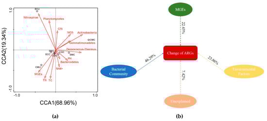 (a) Canonical correspondence analysis (CCA) illustrating relationships between microbial phyla, ARGs and environmental factors, including total nitrogen, total carbon, and pH. The percentage of variation explained by each axis is shown, and the relationship is significant (p < 0.01) based on 999 permutations. (b) Variation partitioning analysis (VPA) differentiates the effects of bacterial communities, environmental factors, and mobile genetic elements (MGEs) on ARG profile alterations. TN: total nitrogen; TC: total organic carbon; and MGEs: mobile genetic elements.