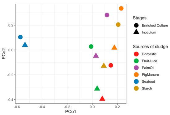Principal Coordinate Analysis (PCoA) plot showing dissimilar microbial profiles of inoculums and enriched propionate-degrading cultures using the Bray–Curtis measure. Each dot represents an individual anaerobic digestion (AD) sample. Shapes represent stages of the samples: triangles for inoculums and circles for enriched cultures. The colors represent samples from different anaerobic sludge sources.