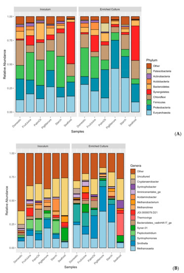 - Kougias, P.G.; Campanaro, S.; Treu, L.; Zhu, X.; Angelidaki, I. A novel archaeal species belonging to Methanoculleus genus identified via de-novo assembly and metagenomic binning process in biogas reactors. Anaerobe 2017, 46, 23–32. [Google Scholar] [CrossRef]