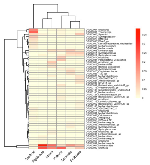 Among the enriched cultures, common and distinct patterns of microbial profiles between different inoculum sources were revealed at the OTU resolution. Figure 3 shows a heatmap of dominant OTUs (greater than 1% relative abundance across all enriched samples) labeled at genus level with their relative abundance. The result reveals 52 dominant OTUs among the propionate-degrading cultures enriched from different inoculum sources from a total of 87 OTUs from both stages (Table S4). The enriched cultures of Domestic and FruitJuice show closet profiles among the six enriched cultures, followed by a pair of PigManure and Starch. Methanosaeta (OTU00003) and Syntrophomonas (OTU00011 and OTU00012) are commonly dominant in the enriched cultures of Domestic and FruitJuice. The Seafood sample showed the most distinguished profile compared to others. Methanosaeta (OTU00001) and Smithella (OTU00002) occurred with high abundance in all of the enriched cultures except the Seafood sample (5.86%–38.38% and 2.79%–23.77%, respectively). Thermovirga (OTU00007, 22.91%) is remarkable as a unique OTU dominant in the enriched culture from the Seafood sludge. In addition, Syntrophobacter (OTU00016, 8.13%), Desulfobacteraceae (OTU00040, 3.66%), Methanospirillum (OTU00025, 2.71%), and Methanosaeta (OTU00041, 2.37%) are also shown with higher abundance in the Seafood sample compared to others. Several unculturable dominant taxa of the class Anaerolineae were observed, for example, OTU00004 (18.62%) in the Seafood, OTU00009 (8.18%) and OTU00028 (1.75%) in the Starch, OTU00014 (7.14%) and OTU00046 (2.3%) in the PalmOil, and OTU00053 (1.34%) in the PigManure samples.