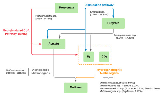 Schematic pathway of methane production based on propionate-degrading cultures enriched from different anaerobic sludge sources excluding the Seafood sample. Colors represent pathways of propionate degradation to methane production; red: methylmalonyl-CoA (MMC) pathway, blue: dismutation pathway, gray: acetoclastic pathway, and yellow: hydrogenotrophic pathway. Microbial taxa found in our study were drawn along the pathways with their percent relative abundance.