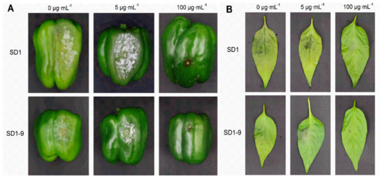 Pathogenicity under different metalaxyl concentrations: Pepper leaves (variety Xinsujiao 5) and green peppers that were fresh, healthy and consistent in size were selected. Strains SD1 and SD1-9 were transferred to 10% V8 medium and cultured in the dark at 25 °C for 5–7 days. Mycelium discs with a diameter of 6–10 mm were cut out. Three small insect needles were used to puncture the surfaces of the pepper leaves and green peppers, and the discs were applied with the mycelium side facing the wound. Each wound was sprayed with 1 mL of metalaxyl medicinal solution, at concentrations of 0, 5, and 100 µg·mL−1. After this treatment, absorbent cotton was put on the wound and moistened for 24 h. Each treatment was repeated four times. A blank 10% V8 medium block was inoculated and sprayed with sterile water as a control. After inoculation, the samples were cultured in a 25 °C light incubator. Lesion size was measured after 72 h and the test was repeated twice.