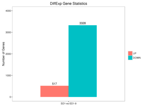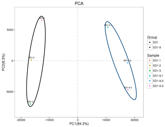 To investigate the replication of the transcriptome samples, we performed principal component analysis (PCA), and the results are shown in Figure 4. The PCA results clearly divided the transcriptome samples into two groups: the control group (SD1-1, SD1-2, SD1-3) and the SD1-9 sample group (SD1-9-1, SD1-9-2, SD1-9-3). The three replicate samples within each group were brought together to form an independent population. According to the numerical values of the sample gene expression in the first principal component (PC1) and the second principal component (PC2), a two-dimensional coordinate map of the principal components was drawn. PC1 (84.2%) and PC2 (8.3%) revealed a change in gene expression of the six samples of 92.5% and showed good agreement between sample biological replicates.