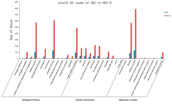 To elucidate the stress response of P. capsici to metalaxyl, we performed a GO functional enrichment analysis on the DEGs. GO is a classification system that describes the functions of genes and the relationships between genes. GO includes three ontologies: molecular function, cellular component, and biological process [22,23]. In the SD1-9 samples, 874 upregulated and 4536 downregulated DEGs were annotated, for a total of 5410 DEGs (Table S2). Of these, 2464 DEGs (397 up, 2067 down) belonged to the biological process category, 1207 DEGs (229 up, 978 down) belonged to the cellular component category, and 1739 DEGs (248 up, 1491 down) belonged to the molecular function category (Figure 6 and Table S2). In the biological process ontology, the functions of the genes were related to biological adhesion, biological regulation, cellular component organization or biogenesis, cellular processes, developmental processes, localization, locomotion, metabolic processes, multi-organism processes, multicellular organismal processes, responses to stimulus, signaling, and single-organism processes. The largest proportions of genes were in the cellular process, metabolic process, and single-organism process categories. Among them, 98 genes were significantly upregulated and 573 genes were significantly downregulated in the cellular process category; 132 genes were significantly upregulated and 613 genes were significantly downregulated in the metabolic process category; and 94 genes were significantly upregulated and 488 genes were significantly downregulated in the single-organism process category. In the cellular component ontology, the gene functions were related to the cell, cell part, macromolecular complex, membrane, membrane part, membrane-enclosed lumen, organelle, organelle part, virion, and virion part. The largest proportions of genes were in the cell and membrane categories; 42 genes were significantly upregulated and 164 genes were significantly downregulated in cell and cell part, 42 genes were significantly upregulated and 214 genes were significantly downregulated in membrane, and 41 genes were significantly upregulated and 200 genes were significantly downregulated in membrane part. In the molecular function ontology, the functions appearing most frequently were antioxidant activity, binding, catalytic activity, molecular function regulator, molecular transducer activity, nuclear acid binding transcription factor activity, signal transducer activity, structural molecule activity, and transporter activity. Among them, the main functions were binding and catalytic activity; 88 genes were significantly upregulated and 567 genes were significantly downregulated in binding, and 129 genes were significantly upregulated and 789 genes were significantly downregulated in catalytic activity. Genes are often associated with multiple different functions, such as the significantly downregulated gene XLOC_020226, which was associated with single-organism process, localization, cellular process, and transporter activity functions. GO analysis showed that genes were significantly upregulated and downregulated in the five categories single-organism process, cellular process, metabolic process, catalytic activity, and binding.