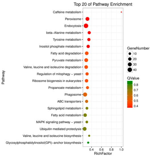The Q-value in KEGG enrichment analysis ranges from 0 to 1; the closer to zero, the more significant the enrichment. Universally regulated genes were enriched in the Caffeine metabolism (ko00232), Peroxisome (ko04146), Endocytosis (ko04144), beta-Alanine metabolism (ko00410), Tyrosine metabolism (ko00350), Inositol phosphate metabolism (ko00562), Fatty acid degradation (ko00071), Pyruvate metabolism (ko00620), Valine, leucine, and isoleucine degradation (ko00280), Regulation of mitophagy-yeast (ko04139), Ribosome biogenesis in eukaryotes (ko03008), and other metabolic pathways (Figure 7 and Table S3).