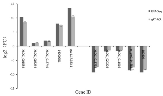 To verify the reliability of the RNA-Seq data, we randomly selected 10 genes in the SD1-9 group for Quantitative Real-Time PCR (qRT-PCR) differential expression verification. Fold changes calculated from qRT-PCR were compared with the RNA-Seq expression analysis data, and the results are shown in Figure 8. The qRT-PCR results were in agreement with the RNA-Seq high-throughput sequencing data, indicating similar expression patterns of up- and downregulated genes in the RNA-Seq and qRT-PCR tests. XLOC_001584, XLOC_005234, XLOC_018749, fgenesh1_pg.C_scaffold_14000251 (14000251), gw1.17.333.1 all showed increased expression, while XLOC_018738, XLOC_020738, XLOC_011516, e_gw1.14.281.1, estExt_fgenesh1_kg.C_180404 (180404) all showed decreased expression (180404). However, the gene expression levels were different, which may have been caused by errors in the experimental process or differences in the quantitative instruments.