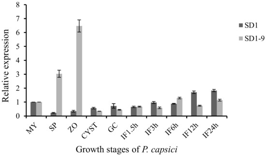 Total RNA was extracted from P. capsici SD1 and SD1-9 at 10 stages, including the mycelia (MY), zoosporangia (SP), zoospores (ZO), cysts (CYST), germinating cysts (GC), and infected pepper leaves at 1.5, 3, 6, 12, and 24 h. The RNA extraction method in each period followed Zhang [42]. The cDNA was synthesized using the TaKaRa PrimeScript™ RT reagent Kit with gDNA Eraser and used as the template for qRT-PCR. The qRT-PCR primers are listed in Table S1.