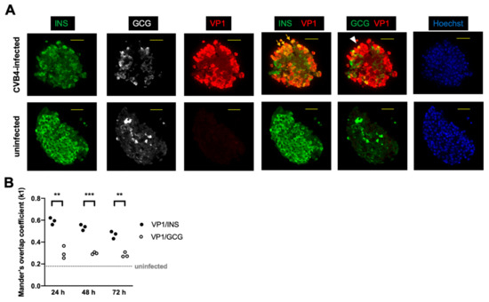 Immunostaining of stem cell-derived β (SC-β) cells revealed abundant insulin (INS)- and glucagon (GCG)-positive cells with viral protein (VP1) predominantly colocalizing with INS. (A) The colocalization of green and red is shown as yellow. Arrows show examples of colocalization between VP1 and INS, and the arrowhead shows colocalization between VP1 and GCG. A representative cell cluster from each condition at 48 h post-infection with coxsackie B virus (CVB)4 (or control uninfected) is shown. INS = green, GCG = white or green, VP1 = red, Hoechst (DNA stain) = blue. Scale bar = 50 μm. (B) Mander’s overlap coefficients (k1) for VP1 and INS and for VP1 and GCG in infected cells are shown at the indicated time points following infection. VP1 and INS colocalized more frequently than VP1 and GCG. (** p < 0.01; *** p < 0.001, multiple t-test). The coefficient was significantly lower for uninfected controls for which the median value is shown as the horizontal dashed line (p < 0.0001, Mann–Whitney test). Each point represents one field of view.