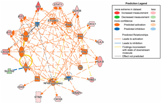 Ingenuity pathway analysis of SC-β cells infected with CVB4 for 48 h (proteomics). Inflammatory and type I IFN pathways were activated.