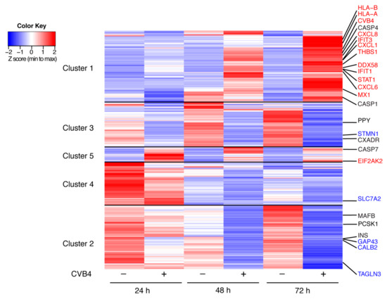 Total RNA was extracted from TRIzol. RNA-Seq libraries were prepared from 10 ng of starting RNA using SMART-Seq. Pooled libraries were sequenced for 2 × 75 cycles to obtain paired end reads using a NextSeq 500 (Illumina, San Diego, CA 92122, USA). Trimmomatic-0.32 was used to remove 5′ or 3′ stretches of bases having an average quality of less than 20 in a window size of 10. Only reads longer than 36 bases were kept for further analysis. RSEM v1.2.28 was used to estimate gene expression, with parameters -p 4-bowtie-e 70-bowtie-chunkmbs 100-strand-specific. Gene quantification was run on the transcriptome (RefSeq v69 downloaded from UCSC Table Browser). The CVB4 reference sequence is GenBank X05690.1. Genes with more than 10 transcripts per million (TPM) in any time point were considered expressed, and genes that did not achieve this threshold were removed from further analysis. The expressed genes were then ranked by their coefficient of variation (decreasing) and the top 1000 genes were determined. For the heatmap, k-means clustering was performed on the data.