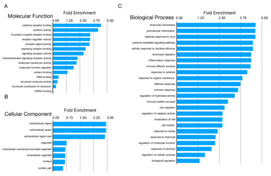 Gene ontology (GO) analysis of most variable genes 24, 48, and 72 h post CVB infection. Figure shows the GO terms for the top 1000 differentially expressed genes identified by RNA-Seq. GO terms are divided into three categories (A) molecular function, (B) cellular component, and (C) biological process.