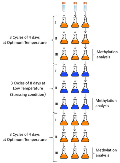 Calibrated (A580 = 0.8, which was considered an average cell concentration = 107 cells/mL) suspensions of 48 h-old cells of N. albida DBVPG 10064 and N. antarctica DBVPG 5271 grown at the respective optimum temperatures were obtained. For each strain 3 Erlenmeyer flasks containing 50 mL of YEPG broth were inoculated using 1 mL of the obtained suspensions. Four other additional serial diluted suspensions (10-fold less concentrated) were obtained for each strain starting from the calibrated one. Each suspension was inoculated in Petri dishes containing YEPG agar medium as single spot (10 µL). Flasks and Petri dishes were incubated at the strains’ respective optimum temperature (25 °C for N. albida DBVPG 10064 and 20 °C for N. antarctica DBVPG 5271) until reaching the stationary phase (Figure 1); flasks were incubated in an orbital shaker (110 rpm). After incubation, the individual steps described above were repeated twice, using the cells derived from the development of the previous inoculum as biomass for the formation of the suspension. The biomass derived from the third inoculation at optimum temperature was stored at −20 °C for the subsequent DNA extraction (Figure 1), and partially used to obtain 3 further seeding and incubation cycles at 4 °C until reaching the stationary phase (Figure 1). The biomass derived from the third inoculation at 4 °C was stored at −20 °C for the subsequent DNA extraction, and partially used to obtain 3 further seeding and incubation cycles at respective optimum temperature until reaching the stationary phase. The biomass derived from the third inoculation at optimum temperature was partially stored at −20 °C for the subsequent DNA extraction. As shown in Figure 1, summarizing cells for DNA extraction were sampled three times: at the end of the third cycle of incubation at optimum temperature (control condition), at the end of the third cycle of incubation at 4 °C (cold stress), and at the end of the third cycle of the second incubation at optimum temperature (recovery from cold stress). All the tests were performed in triplicate (three independent biological repetitions). Yeast growth was monitored at the end of each cycle using dry mass weight and viable cell counts on YEPG agar plates [44].