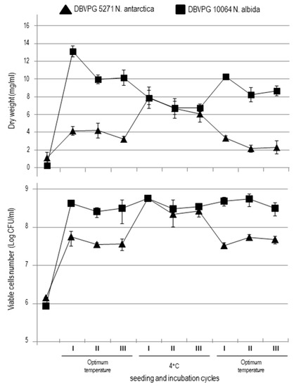 The growth of N. albida DBVPG 10064 and N. antarctica DBVPG 5271, monitored at the end of each cycle (Figure 1), showed a well-defined trend.