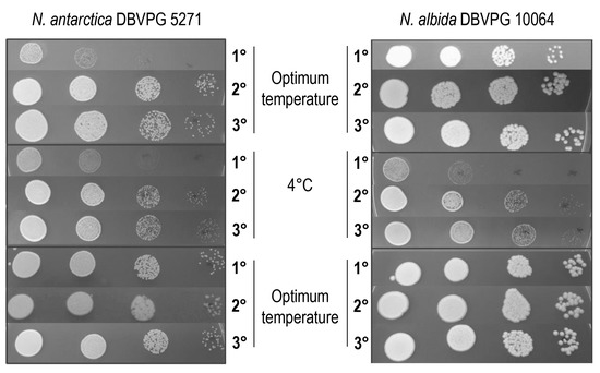 This trend was confirmed by the serial diluted suspensions inoculated as single spots in Petri dishes (Figure 3). At the respective optimum temperatures, the growth of N. albida strain was appreciably more abundant than N. antarctica, but when the strains were moved to 4 °C, the two cultures showed a similar growth. In particular, the observable growth of N. antarctica at 4 °C was similar to that observed at optimum incubation temperature while that of N. albida was less abundant than that at 25 °C (Figure 3).